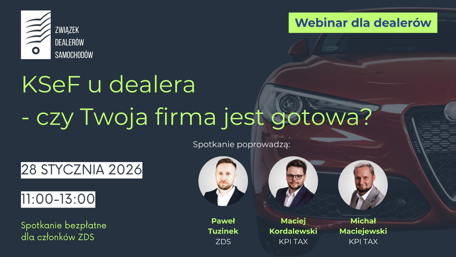 Zapraszamy na specjalistyczny webinar poświęcony wdrożeniu Krajowego Systemu e-Faktur w branży automotive organizowany przez Związek Dealerów Samochodów. Wydarzenie skierowane jest w szczególności do właścicieli firm, osób zarządzających, dyrektorów finansowych oraz głównych księgowych, którzy chcą skutecznie przygotować swoje przedsiębiorstwa do nadchodzących zmian w fakturowaniu. Spotkanie poprowadzą eksperci: Paweł Tuzinek radca prawny oraz prezes ZDS oraz doradcy podatkowi Maciej Kordalewski i Michał Maciejewski z KPI TAX, którzy omówią praktyczne aspekty nowych przepisów w realiach pracy dealera. Istotną częścią szkolenia będzie interaktywna sesja pytań i odpowiedzi, podczas której uczestnicy będą mogli rozwiać wszelkie wątpliwości dotyczące specyfiki swoich procesów.